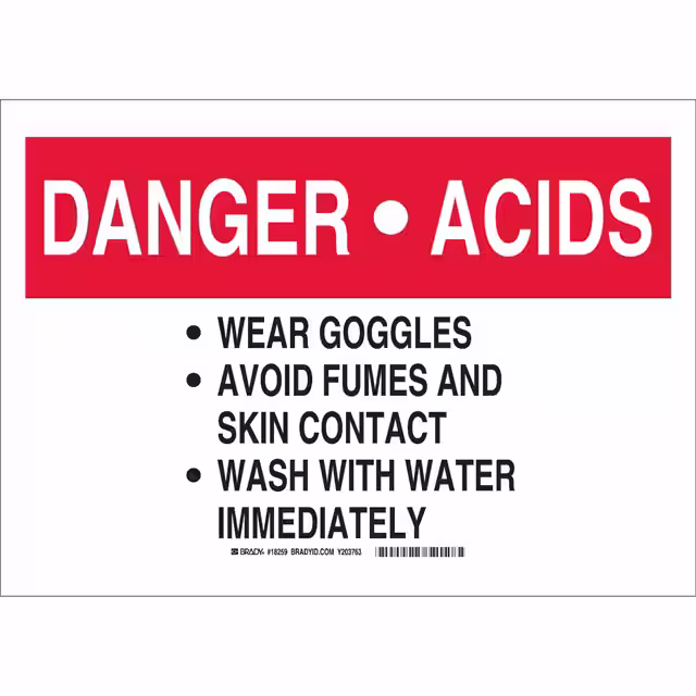 Brady® | Bulk | Active | Black and Red Legend, White Background | Danger | Aluminum | Danger Acids. Wear Goggles Avoid Fumes And Skin Contact Wash With Water Immediately | 14.00" L x 10.00" W (355.6mm x 254.0mm) |